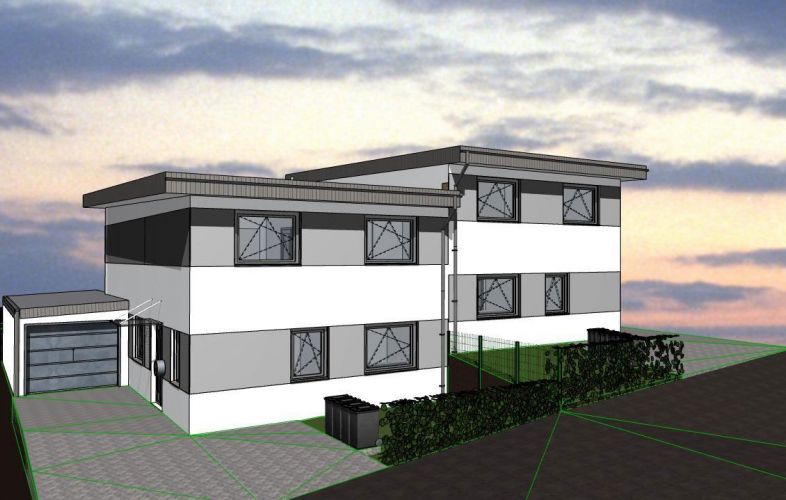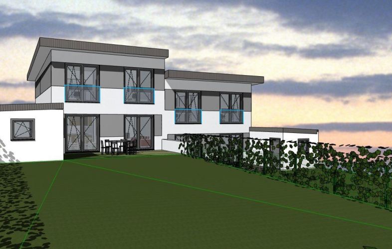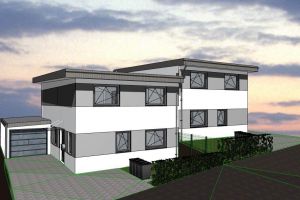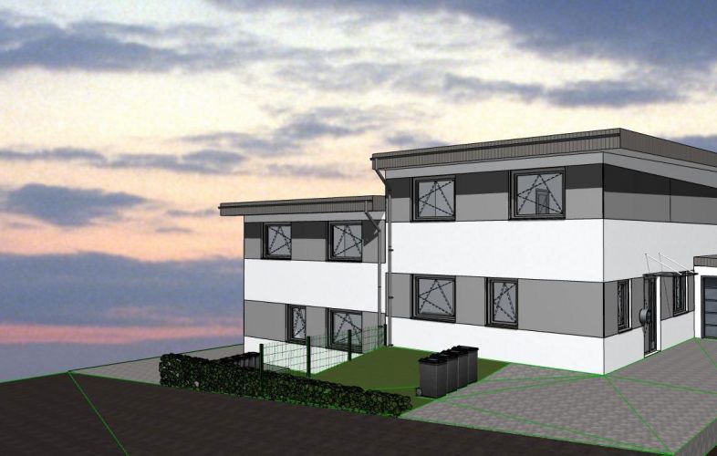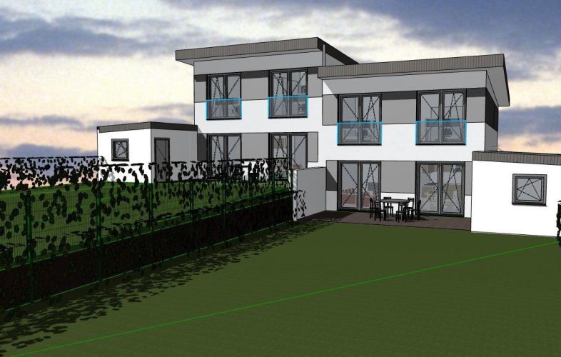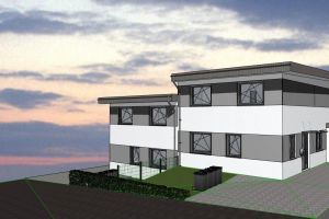 Die Doppelhaushälfte wird in Massivbauweise mit einem Pultdach errichtet. Die Wohnfläche beträgt ca. 151,00 m2 und verteilt sich vom Erdgeschoss bis zum Obergeschoss. Der großzügige Garten ist mit einer Terrasse ausgestattet und nach Süden ausgerichtet. Eine Garage grenzt unmittelbar an das Gebäude und ein Außenstellplatz steht vor der Hausfront zur Verfügung.